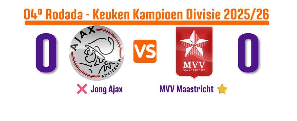 ❌ Com o empate, o Jong Ajax chegou aos quatro gols na 11ª colocação. O próximo compromisso dos jovens de Amsterdã será contra o Roda JC Kerkrade, fora de casa.